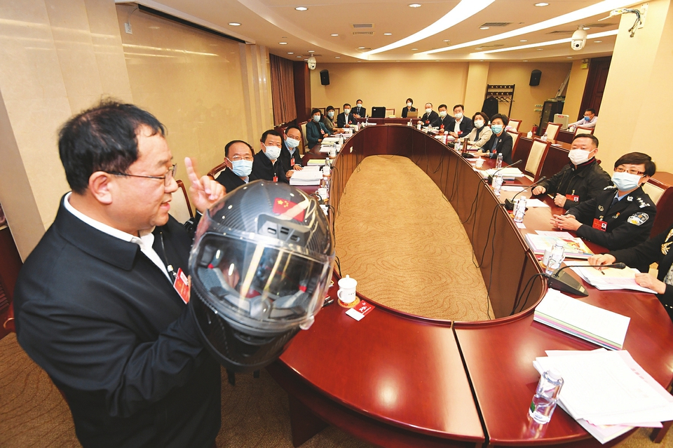 3月7日,山西代表團舉行小組會議。呂春祥代表對政府工作報告提出的“今年深入實施創(chuàng)新驅動發(fā)展戰(zhàn)略”深感振奮,對“推進科技創(chuàng)新,促進產(chǎn)業(yè)優(yōu)化升級,突破供給約束堵點,依靠創(chuàng)新提高發(fā)展質量”充滿信心。他展示了其所在的中科院山西煤化所和山西鋼科碳材料有限公司碳纖維聯(lián)合團隊研發(fā)的TG800碳纖維材料,這一材料應用于雪車頭盔,成為今年北京冬奧會上亮眼的山西名片。(記者李聯(lián)軍攝)