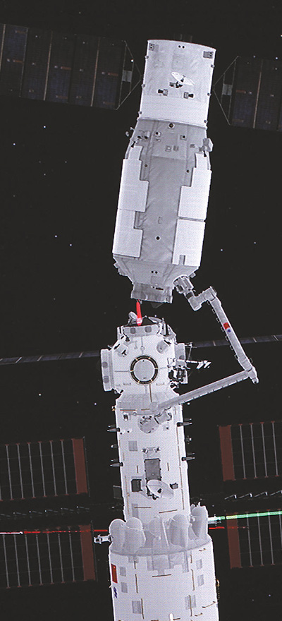 在北京航天飛行控制中心拍攝的空間站機(jī)械臂轉(zhuǎn)位貨運(yùn)飛船試驗(yàn)畫面,天舟二號(hào)貨運(yùn)飛船在機(jī)械臂拖動(dòng)下,以核心艙節(jié)點(diǎn)艙球心為圓心進(jìn)行平面轉(zhuǎn)位。