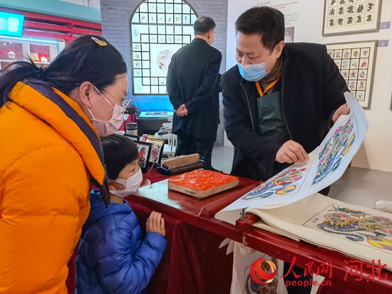 武強(qiáng)木版年畫省級(jí)非遺傳承人康英勤向小朋友介紹武強(qiáng)木版年畫。 河北省群眾藝術(shù)館(省非遺保護(hù)中心)供圖