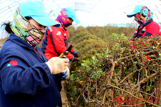 技術(shù)人員在定州二明月季種植基地修剪月季。 周永攝