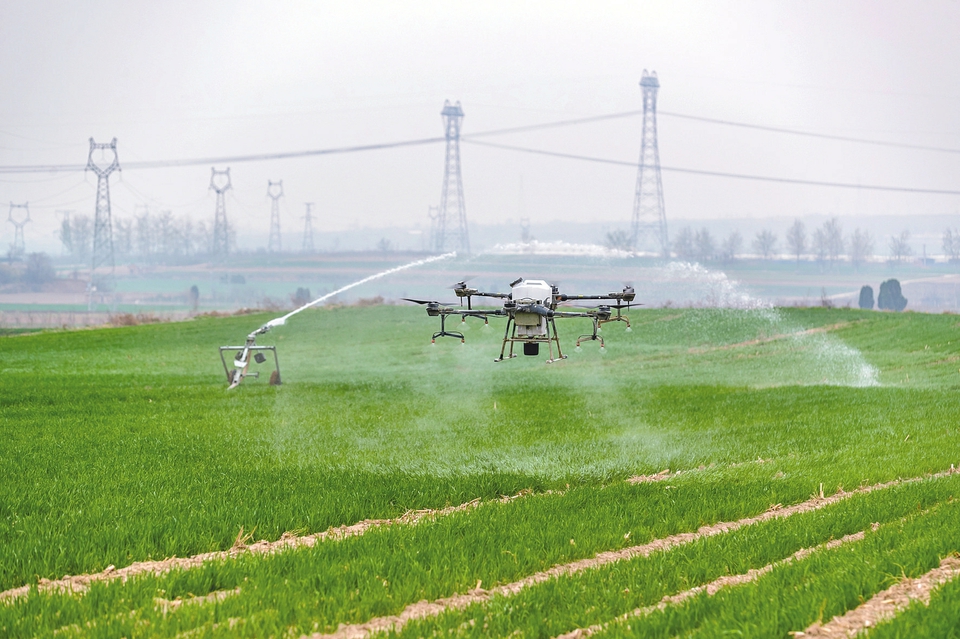 3月21日,在運(yùn)城市夏縣胡張鄉(xiāng)新晉村有機(jī)旱作小麥基地,當(dāng)?shù)剞r(nóng)民利用植保無(wú)人機(jī)為麥田施肥。眼下正值春耕春管的關(guān)鍵期,夏縣糧農(nóng)搶抓有利農(nóng)時(shí),對(duì)全縣31.6萬(wàn)畝冬小麥開(kāi)展病蟲(chóng)草害和極端天氣的應(yīng)對(duì)防范,及早動(dòng)手澆水、施肥、噴藥,全面開(kāi)展春季麥田管理,提高畝產(chǎn)效益,為全年糧食豐收打下堅(jiān)實(shí)基礎(chǔ)。(閆鑫攝)