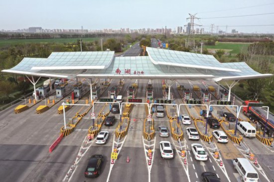 3月28日下午,在嘉興高速南湖收費(fèi)站外廣場(chǎng),防疫人員對(duì)來嘉車輛進(jìn)行健康碼、行程卡的檢查,守好嘉興“南大門”。(趙穎碩)