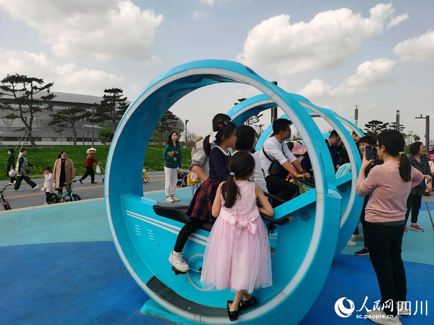 在這個“熊貓火炬手”的對面,一條“體育星光大道”綿延鋪展而來。在這條路上,每隔一段距離就會有一組圖標和漢字,標注著某一項體育運動,如網(wǎng)球、跳水等。這個構(gòu)思,從整體上詮釋了大運會蘊含的眾多體育項目,也能讓那些偏好某個項目的游客找到喜歡的體育坐標點,提升起體育游園的氣氛。