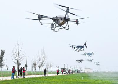 石家莊市欒城區(qū)恒豐種植專業(yè)合作社的麥田里,麥苗從地里冒出來一拃左右,十幾臺大型植保無人機(jī)和智能化農(nóng)機(jī)正在對麥田進(jìn)行水肥綜合治理作業(yè)。