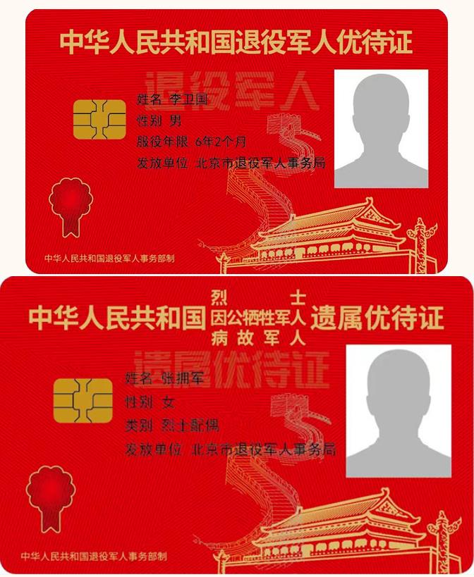據(jù)介紹,優(yōu)待證以紅色為基調,正面印有優(yōu)待證種類名稱,持證人基本信息、相片等。背面印有制證銀行名稱、銀行卡號等信息。優(yōu)待證分為“中華人民共和國退役軍人優(yōu)待證”“中華人民共和國烈士、因公犧牲軍人、病故軍人遺屬優(yōu)待證”兩種,分別面向符合條件的退役軍人和烈士遺屬、因公犧牲軍人遺屬、病故軍人遺屬等其他優(yōu)撫對象免費發(fā)放,是持證人彰顯榮譽的載體、享受優(yōu)待的憑證。