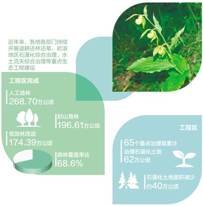 近年來,各地各部門持續(xù)開展退耕還林還草、巖溶地區(qū)石漠化綜合治理、水土流失綜合治理等重點生態(tài)工程建設(shè)。據(jù)統(tǒng)計,工程區(qū)完成人工造林268.70萬公頃、封山育林196.61萬公頃、低效林改造174.39萬公頃,森林覆蓋率達68.6%;工程區(qū)65個重點治理縣累計治理石漠化土地62萬公頃,石漠化土地面積減少約40萬公頃。