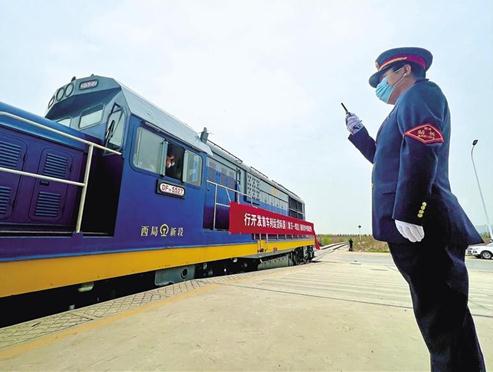 3月30日上午,寶雞東南亞國際班列發(fā)車儀式上,工作人員下達(dá)發(fā)車指令。本報(bào)記者 李宛嶸攝
