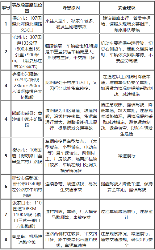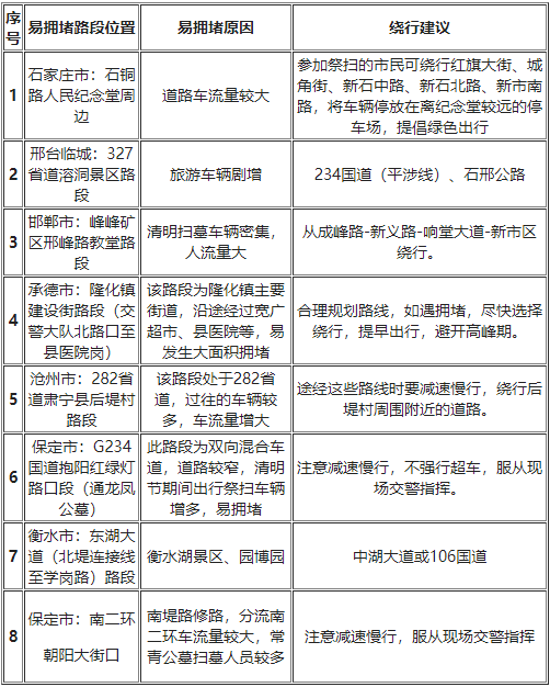 有可能出現(xiàn)大流量的站口:石家莊四個(gè)端口站、青銀趙縣口、京港澳七一口、大廣衡水北、首都環(huán)線(xiàn)(張涿段)野三坡、百草畔、百里峽。有可能出現(xiàn)擁堵的互通立交:京臺(tái)與京滬互通、新元與京港澳互通(南)。