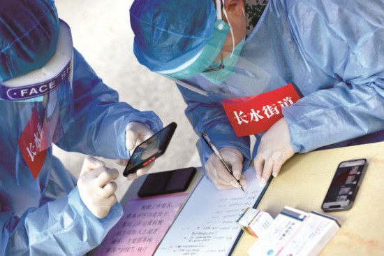 3月31日,嘉興經(jīng)開(kāi)區(qū)城南街道良秀社區(qū)元一柏莊內(nèi)的兩個(gè)點(diǎn)位上,工作人員通知居民排隊(duì)有序登記需求藥品并盡可能幫忙購(gòu)買(mǎi),滿(mǎn)足管控區(qū)居民日常需求。(王蓉)