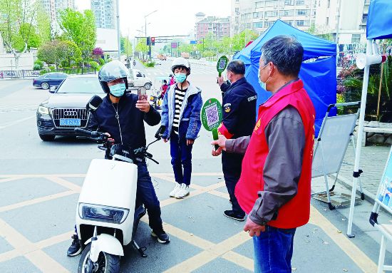 4月5日,在金華婺城區(qū)城東街道通園路社區(qū)各暖心服務(wù)點(diǎn)、小區(qū)出入口,管理人員落實(shí)測(cè)溫、亮碼、戴口罩的要求,“場(chǎng)所碼”逢進(jìn)必掃,社區(qū)自行設(shè)計(jì)了便攜式“掃碼桿”。使用“掃碼桿”后,過往車輛和行人掃碼的效率明顯提高,縮短了通過時(shí)間,拉開了志愿者和來往車輛及人員的距離,避免人員接觸。(時(shí)寬兵)