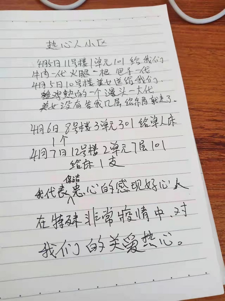 “4月5日,11號(hào)樓1單元101,給我們牛肉一袋,火腿一根,包子一袋;4月5日,10號(hào)樓送來整雞一個(gè),饅頭一大袋,但是沒有留下具體門牌就走了;4月6日,8號(hào)樓3單元301給單人床一個(gè);4月7日,12號(hào)樓2單元7層101給床一個(gè)。我代表保潔衷心地感謝好心人,在非常時(shí)期,對(duì)我們的關(guān)愛?!?/p>