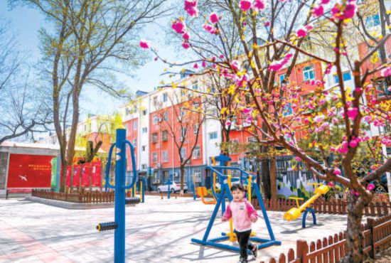 大興區(qū)興豐街道老小區(qū)黃村西里社區(qū)在居民的共同維護(hù)下,居住環(huán)境整潔舒適。圖為提升后的社區(qū)廣場上,小朋友正在樂享春光。本報記者 武亦彬攝