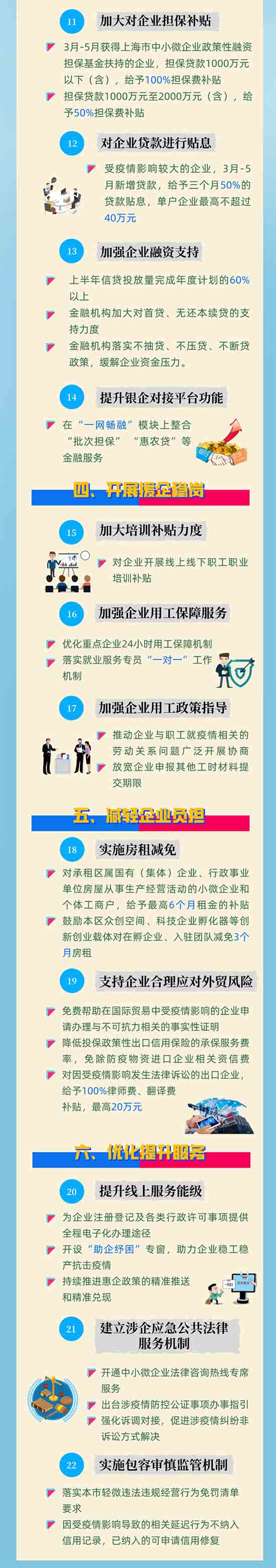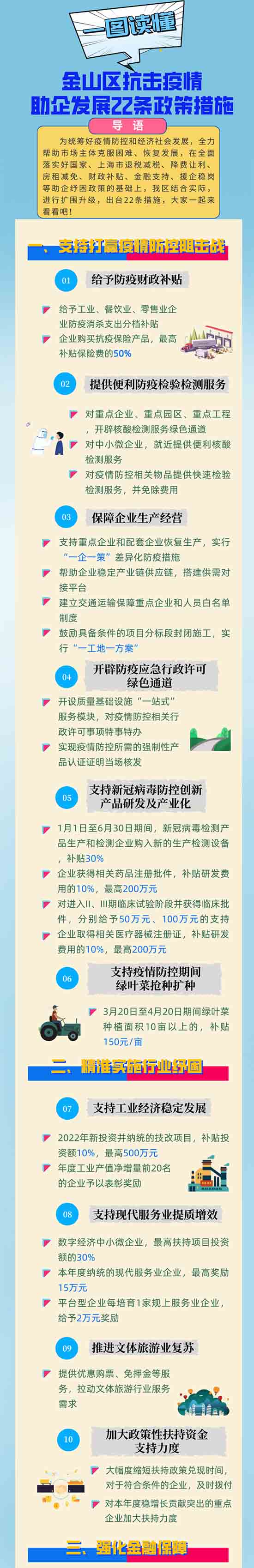 據(jù)悉,為統(tǒng)籌好疫情防控和經(jīng)濟社會發(fā)展,全力幫助市場主體克服困難、恢復發(fā)展,在全面落實好國家、上海市退稅減稅、降費讓利、房租減免、財政補貼、金融支持、援企穩(wěn)崗等助企紓困政策的基礎(chǔ)上,結(jié)合金山實際,進行擴圍升級,制訂《金山區(qū)抗擊疫情助企發(fā)展22條政策措施》?!?2條”既聚焦企業(yè)當前面臨的“難點”“痛點”“堵點”,又考慮到疫情后企業(yè)加快發(fā)展的各項訴求,共計包括六大方面內(nèi)容,即支持打贏疫情防控阻擊戰(zhàn)、精準實施行業(yè)紓困、強化金融保障、開展援企穩(wěn)崗、減輕企業(yè)負擔及優(yōu)化提升服務(wù),用實實在在的舉措,精準幫助市場主體紓困解難,穩(wěn)定經(jīng)濟增長。