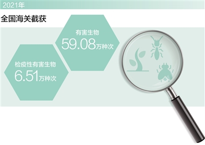 據(jù)統(tǒng)計(jì),2021年,全國海關(guān)截獲有害生物59.08萬種次、檢疫性有害生物6.51萬種次,首次檢出致死粒線蟲、鈴蘭短體線蟲、北美齒小蠹等危險(xiǎn)性有害生物,有效防止紅火蟻、高致病性禽流感等重大動(dòng)植物疫情疫病傳入,退回、銷毀不合格農(nóng)產(chǎn)品584批。