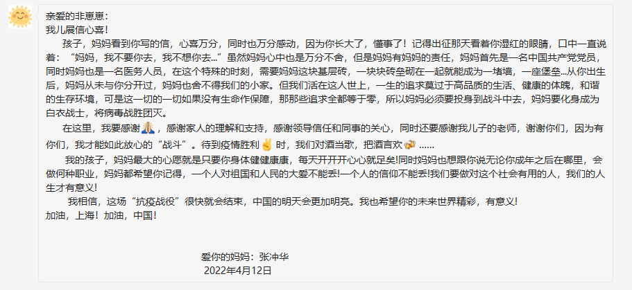 “媽媽希望你記得,一個(gè)人對祖國和人民的大愛不能丟!一個(gè)人的信仰不能丟!我們要做對這個(gè)社會有用的人,我們的人生才有意義……”回信中,張沖華用自己的實(shí)際行動引導(dǎo)兒子,并希望他的未來更加精彩。