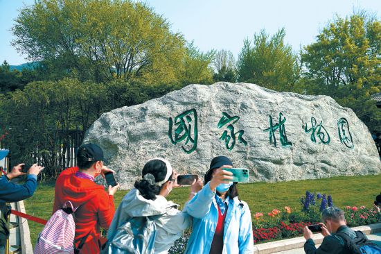 圖:昨天,國家植物園正式在北京揭牌,吸引眾多游客拍照留影。 本報記者 程功攝
