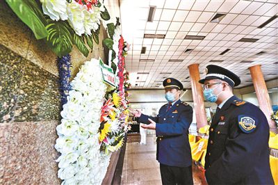 隨后,執(zhí)法人員又來到通州區(qū)殯儀館進行檢查。進入殯儀館的業(yè)務大廳,左側(cè)的墻上懸掛著大大小小的花圈,每一個花圈旁都附有一個醒目的商品價簽,價格從100元到300元不等,商品名稱為“租花圈”。在正前方空地上擺放的鮮花花籃上,也都附有待租的名牌及價簽。