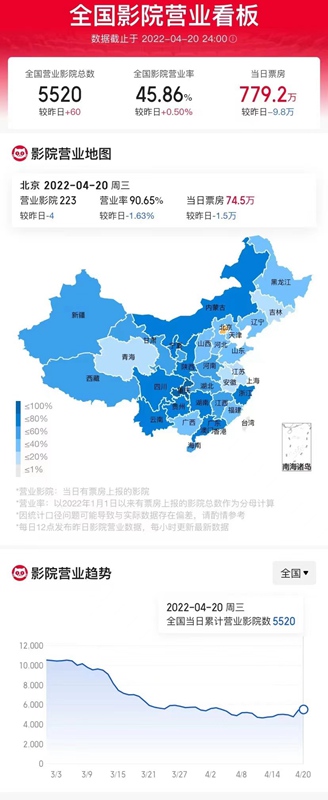 據(jù)國(guó)內(nèi)某專業(yè)電影數(shù)據(jù)平臺(tái),4月20日全國(guó)影院營(yíng)業(yè)率45.86%,營(yíng)業(yè)影院5520家,較上日增加60家,大盤票房779.2萬(wàn)元。截至4月20日23時(shí),浙江省單日票房(4月20日)約為64萬(wàn)元,總出票17678張,總場(chǎng)次13722場(chǎng),平均票價(jià)36元。