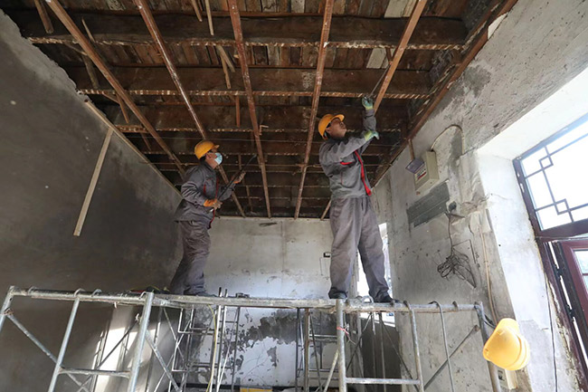 按照計劃,樓頂將由原來的木質大屋脊整體更換為樹脂瓦阻燃屋面。而在第一階段改造中,樓體阻燃,為居民量身訂制燃氣柜,配備24小時巡護“管家”,每天進行巡查記錄并拍攝現(xiàn)場照片均已完成。一層的臨街房屋內的夾層已經拆除完畢,木制窗已經更換為塑鋼窗,原來的薄墻面上加裝硅酸鈣板,地面鋪設了耐火地板磚,屋頂?shù)跹b了石膏板。二層樓內木樓板已鋪設耐火瓷磚,樓內電線電纜進行了梳理排查,完成了整體更換,鋪設了不銹鋼槽式電纜橋架,確保樓內居民用電安全穩(wěn)定。