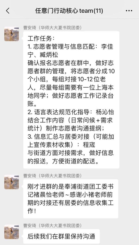 “我自己家里也有爺爺奶奶,在封控管理期間,我總是掛念著家里老人的生活情況,他們其實非常需要幫助。這是一個有愛有意義的活動,所以我第一時間報名,希望成為可以守護(hù)老人的可靠力量?!?018級英語專業(yè)學(xué)生譚彤彤說。