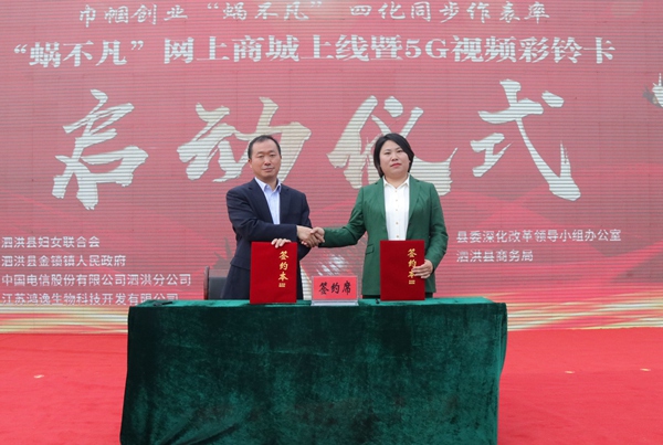 近日,江蘇省泗洪縣婦聯(lián)、改革辦、商務(wù)局、金鎖鎮(zhèn)人民政府和電信公司聯(lián)合舉辦“巾幗創(chuàng)業(yè)‘蝸不凡’,‘四化’同步作表率”現(xiàn)場(chǎng)活動(dòng),助力鄉(xiāng)村企業(yè)數(shù)字化復(fù)工復(fù)產(chǎn)?!拔伈环病本W(wǎng)上商城正式上線,5G視頻彩鈴卡同步啟動(dòng),電信公司和“蝸不凡”品牌企業(yè)簽訂了“云改數(shù)轉(zhuǎn)”合作協(xié)議。