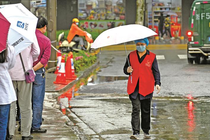 4月26日,在嘉興南湖區(qū)建設(shè)街道核酸采樣點(diǎn),身穿紅馬甲的志愿者在風(fēng)雨中堅(jiān)守崗位,為前來(lái)做核酸檢測(cè)的市民查驗(yàn)“一碼一卡”。在疫情防控常態(tài)化下,志愿者持續(xù)奔赴在“疫”線(xiàn),為筑牢疫情防控網(wǎng)發(fā)光發(fā)熱。(張啟帆)