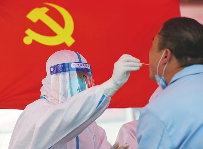 把黨旗插在第一線,以實(shí)際行動(dòng)筑牢疫情防控“紅色防線”。4月26日,太原市迎澤區(qū)開(kāi)展第三輪全員核酸檢測(cè),在各個(gè)檢測(cè)點(diǎn),最忙碌的還是身著防護(hù)服的“大白”,他們耐心又細(xì)致地為居民做著核酸檢測(cè)。武六紅 攝
