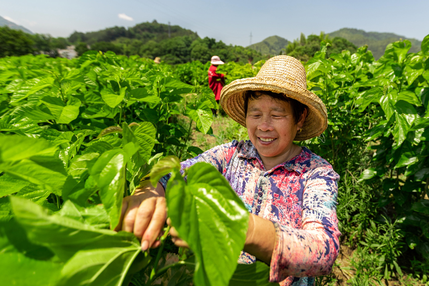 在澧田鎮(zhèn)雙江村蠶?;?,蠶農(nóng)在采摘桑葉。朱國(guó)朝攝