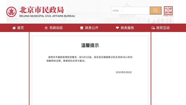 人民網(wǎng)北京5月7日電 據(jù)北京市民政局官網(wǎng)消息,按照北京市最新疫情防控要求,自5月5日起,前往各區(qū)婚姻登記機關須持48小時內核酸陰性證明。