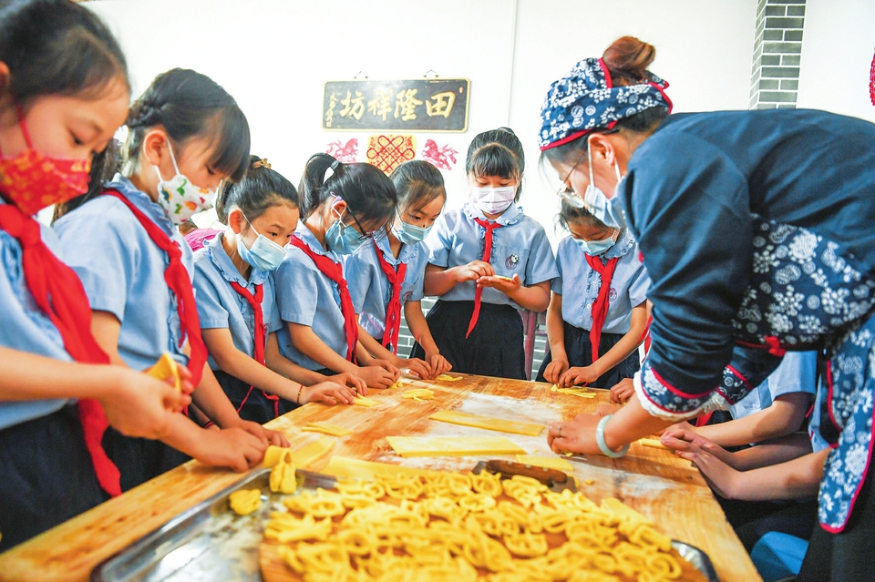 5月3日,平遙縣實驗小學(xué)三年級463班的學(xué)生在平遙縣田隆祥油花花非遺傳學(xué)基地體驗油花花、月餅等傳統(tǒng)食品的制作過程。“五一”期間,平遙縣實驗小學(xué)在做好疫情防控的同時,組織學(xué)生就地開展多種形式的非遺文化項目傳學(xué)活動,讓孩子們近距離感受非遺文化的魅力,豐富假期生活。(梁生仁攝)