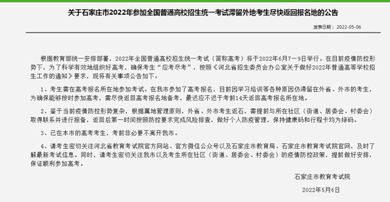 人民網(wǎng)石家莊5月7日電 (祝龍超) 5月6日,石家莊市教育考試院發(fā)布公告,敦促2022年參加全國普通高校招生統(tǒng)一考試滯留外地考生需要盡快返回報(bào)名地。已在本市的高考考生,考前非必要不離開石家莊。