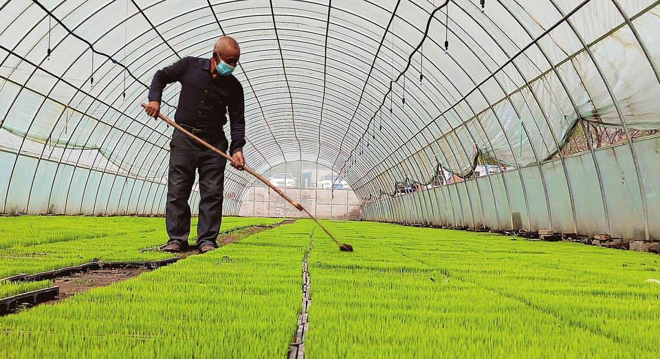 5月14日,太原市晉源區(qū)花塔村育秧基地村民正在護(hù)理秧苗。眼下正是農(nóng)忙時節(jié),晉源區(qū)在去年花塔村自動育秧基地的基礎(chǔ)上,新擴(kuò)建王郭村、北大寺村、稻花城3個育秧基地,優(yōu)選新稻種,擦亮區(qū)域性特色農(nóng)產(chǎn)品品牌。當(dāng)?shù)赜行蚪M織村民推進(jìn)育秧、整地等,滿足全區(qū)3300畝晉祠水稻的插秧需求。(記者李兆民攝)