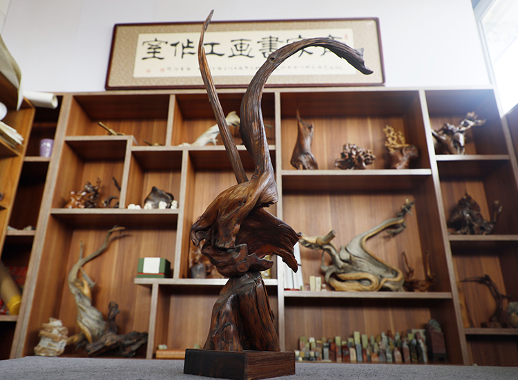 在眾多作品中,王洪義最喜歡的還是一件雄鷹展翅的根雕,這件作品保留了老槐木樹根的形態(tài)特性,利用刻刀、鋼絲等工具將雄鷹豐滿的羽翼刻畫得惟妙惟肖,達(dá)到了在遼闊蒼穹中,迎風(fēng)翱翔的意境。王洪義說:“這件作品跟我本人的經(jīng)歷很像,面對困境,總有一種不屈的精神,每次看到它,心里總會充滿一種力量,迎接各種挑戰(zhàn)?!保ń饬⒔?jīng))
