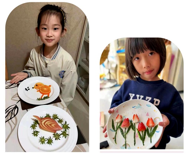 黑芝麻胡同小學學生展示和家長一起制作的水果拼盤