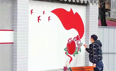 圖為專業(yè)人員對墻體進(jìn)行主題彩繪。朱明鑰 李朋林 攝影報道