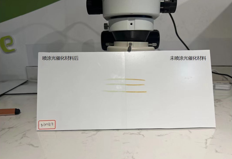 “將一塊鋁面板一分為二,一塊噴涂光催化涂膜,另一塊不噴涂。用有機染料筆模仿外界污染物,在兩塊材料表面標(biāo)記后,通過一分鐘紫外光燈照射,可看出噴涂了光催化涂膜的瓷磚鋁板部分染料降解效果明顯更高。”工作人員告訴人民網(wǎng)浙江頻道,根據(jù)國家權(quán)威檢測機構(gòu)的實驗證明,每噴涂1立方米的光催化涂膜,就能清除95%的甲醛。
