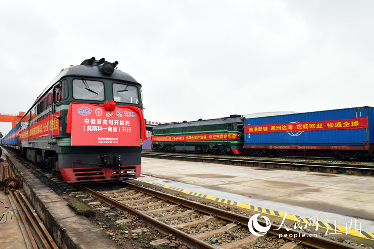 2月19日,2022年江西省首列中俄雙向?qū)﹂_(kāi)班列(南昌—莫斯科)在南昌向塘國(guó)際陸港成功到發(fā)?!皩?duì)開(kāi)班列”的開(kāi)行將大大提高集裝箱周轉(zhuǎn)效率,降低企業(yè)運(yùn)輸成本。 人民網(wǎng) 時(shí)雨攝