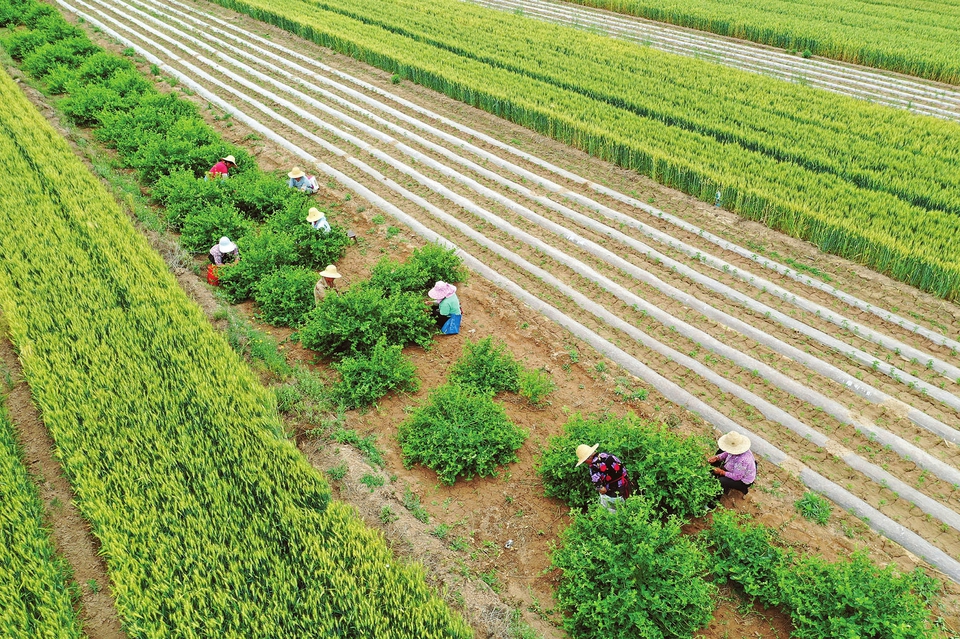 5月27日,新絳縣澤掌鎮(zhèn)吳嶺莊村,村民在采摘金銀花。連日來,當?shù)剞r(nóng)民抓緊晴好天氣,加強對頭茬早熟玉米、辣椒、大蔥、中藥等進行田間管理。(高新生攝)