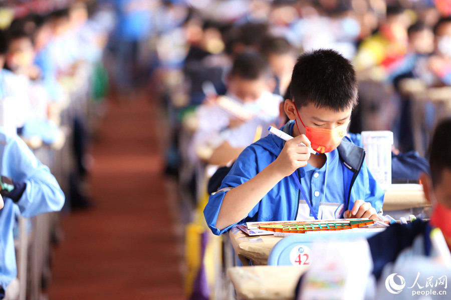 活動現(xiàn)場,選手們列隊進(jìn)入各自賽場,用畫筆在龍舟模型素材板上畫出各式圖案,再將一個個零部件手工拼接,組裝成一條條獨具特色的“小龍舟”,船體或是金銀鱗甲,或是祥云波浪,色彩斑斕,風(fēng)格不一。