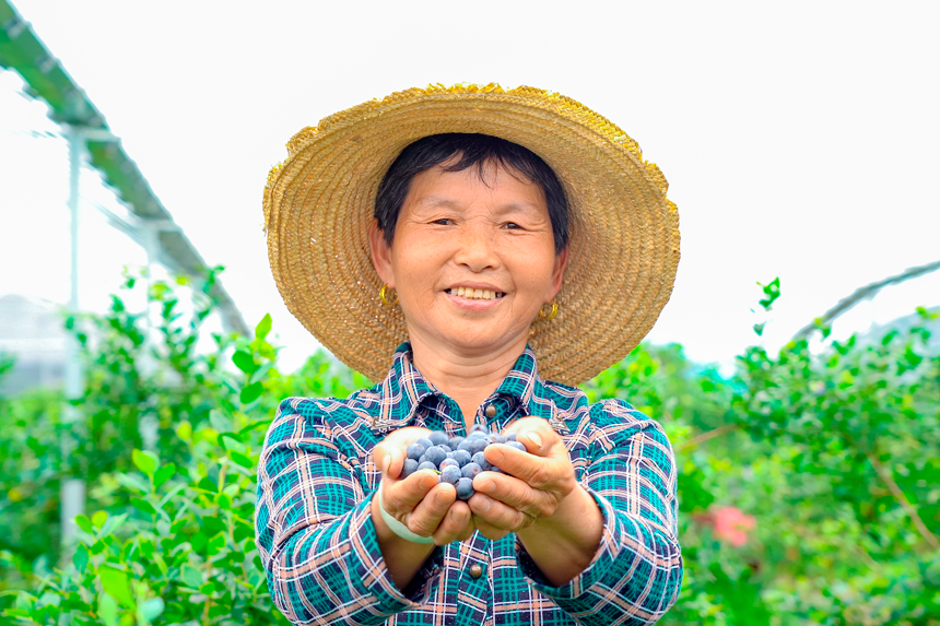 5月27日,江西省吉安市峽江縣巴邱鎮(zhèn)胡姚家村藍(lán)莓基地里,農(nóng)戶展示采摘的藍(lán)莓。鄧海明攝