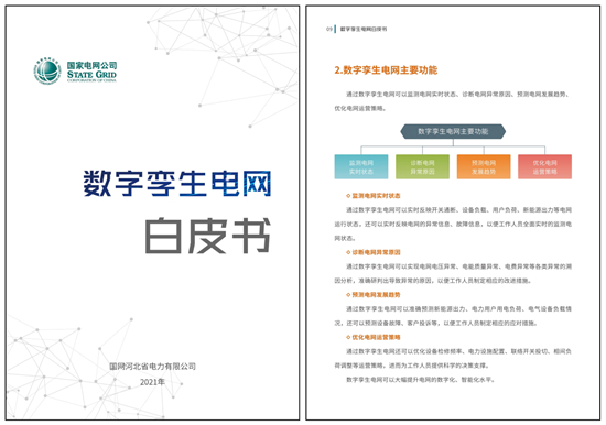 2021年7月,國網(wǎng)河北電科院聯(lián)合多家單位編制完成并發(fā)布了國內(nèi)電網(wǎng)領(lǐng)域首個《數(shù)字孿生電網(wǎng)白皮書》。白皮書歸納總結(jié)了雄安數(shù)字孿生建設(shè)成果,系統(tǒng)闡述了數(shù)字孿生電網(wǎng)的主要功能、體系架構(gòu)以及維護(hù)管理方式等內(nèi)容,創(chuàng)造性地提出了數(shù)字孿生電網(wǎng)的技術(shù)架構(gòu)和技術(shù)實(shí)現(xiàn)方式,對今后數(shù)字孿生技術(shù)在電網(wǎng)領(lǐng)域的探索應(yīng)用具有較強(qiáng)的指導(dǎo)意義。