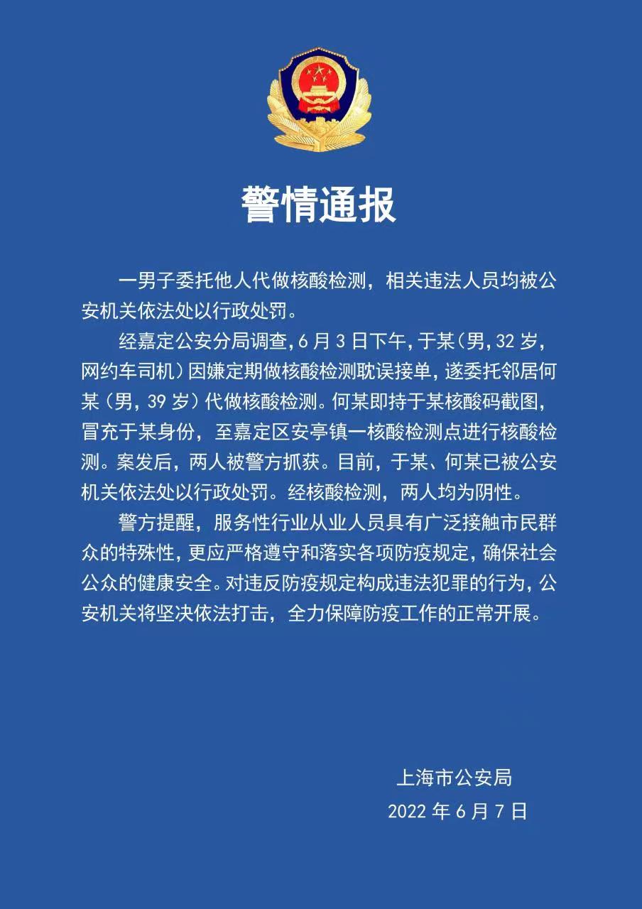 經(jīng)嘉定公安分局調(diào)查,6月3日下午,于某(男,32歲,網(wǎng)約車司機(jī))因嫌定期做核酸檢測耽誤接單,遂委托鄰居何某(男,39歲)代做核酸檢測。何某即持于某核酸碼截圖,冒充于某身份,至嘉定區(qū)安亭鎮(zhèn)一核酸檢測點進(jìn)行核酸檢測。案發(fā)后,兩人被警方抓獲。目前,于某、何某已被公安機(jī)關(guān)依法處以行政處罰。經(jīng)核酸檢測,兩人均為陰性。