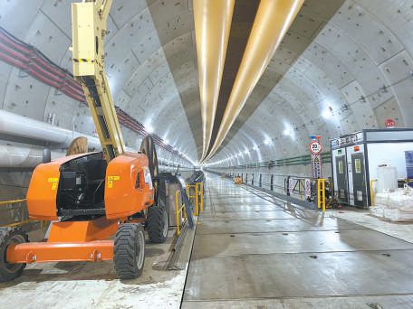 走進(jìn)項(xiàng)目工地,沒有想象中的機(jī)械轟鳴聲,施工現(xiàn)場位于幾十米深的地下。記者從地面乘坐直梯,順著盾構(gòu)機(jī)始發(fā)井,來到地下26米處的西線隧道內(nèi)。國產(chǎn)最大直徑泥水平衡盾構(gòu)機(jī)“京華號”,已在西線隧道里向前掘進(jìn)了近4000米。眼前的西線隧道,蜿蜒著向南延伸。開工初期,記者從始發(fā)井步行幾分鐘即可抵達(dá)盾構(gòu)機(jī)駕駛艙位置;這次采訪,施工方特意安排了1輛純電動(dòng)代步車。“現(xiàn)在盾構(gòu)機(jī)離始發(fā)井有些遠(yuǎn),工作人員上下班都得坐車?!瘪{駛員說,這輛電動(dòng)代步車是用吊車吊到隧道內(nèi)的,還特意為它在隧道里安了充電樁,“這輛車再回到地面,就得是隧道貫通的時(shí)候啦!”