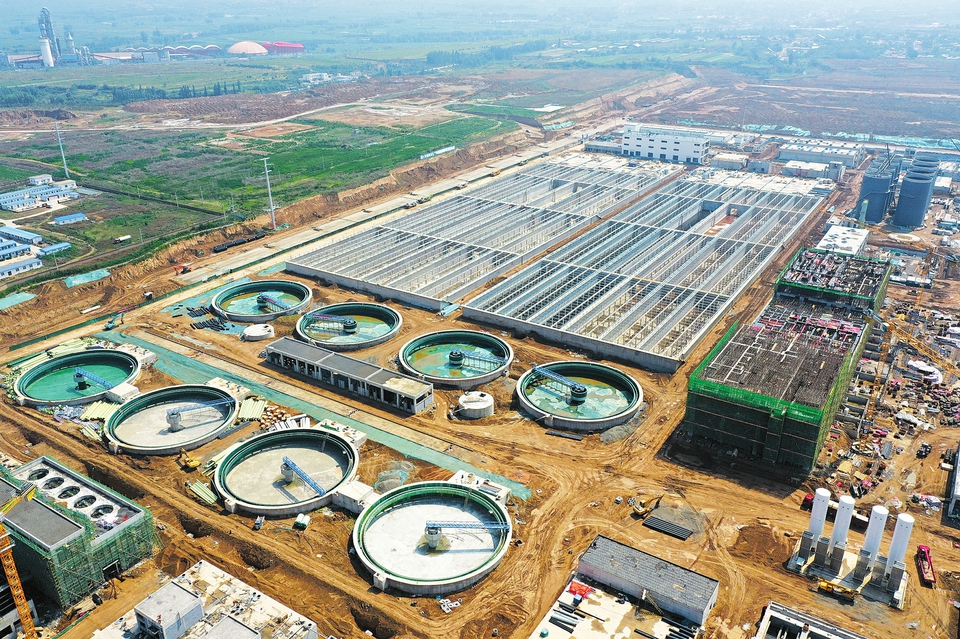 6月27日,航拍下的山西綜改示范區(qū)山西合成生物產業(yè)生態(tài)園污水處理及再利用項目已現雛形。該項目是目前全國投資規(guī)模最大、處理標準最高、分鹽量最大的工業(yè)園區(qū)污水處理項目,總規(guī)劃用地約800畝,總投資21.38億元,建成后日污水處理量最高達14.4萬噸。(記者孫榮祥攝)