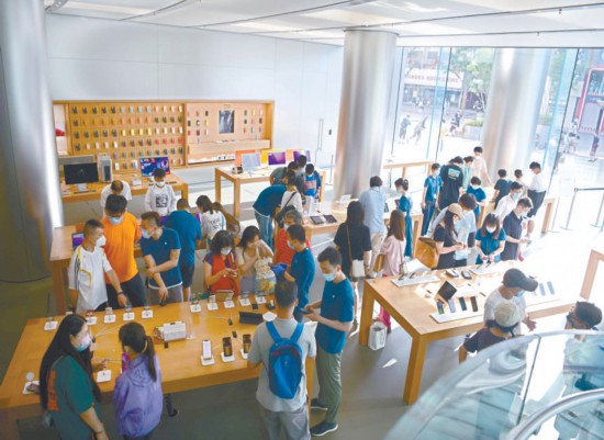 昨天,王府井APM購物中心蘋果產品零售店內,顧客在手機展示臺前駐足瀏覽,商場內客流逐漸恢復。本報記者 和冠欣攝