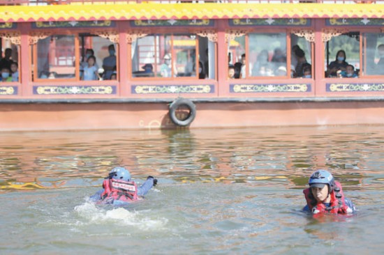 演練活動中,救援隊員下水示范,帶來直觀的教育效果。本報記者 甘南攝