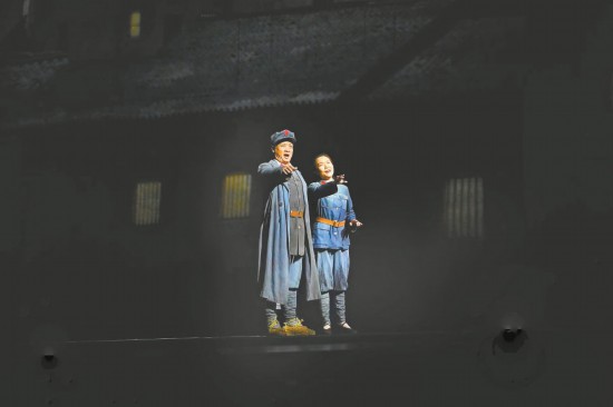 “閻老師可以再往前走幾步,要不然后面的合唱團(tuán)一上來有點(diǎn)擠。”舞臺(tái)監(jiān)督陳歡用激光筆指了一下舞臺(tái)的前側(cè)區(qū)域。歌唱家閻維文點(diǎn)點(diǎn)頭,對(duì)臺(tái)下比了“OK”的手勢(shì)。燈光再次到位,排練繼續(xù),多媒體影像配合著兩側(cè)峭壁般聳立的舞美裝置,讓湘江翻涌的江水和咆哮的戰(zhàn)火穿越歷史,滾滾而來。
