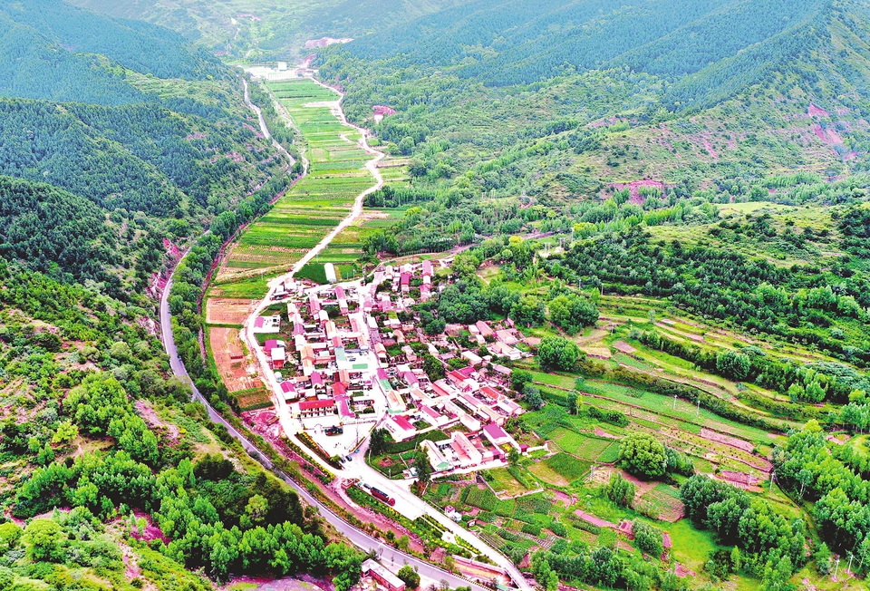7月24日,俯瞰古交市邢家社鄉(xiāng)宋家莊村,道路蜿蜒,榛林蔥翠。近年來,該村依托當?shù)刈匀画h(huán)境優(yōu)勢,以經(jīng)濟聯(lián)合社占股60%、農(nóng)民承包地入股占40%的方式經(jīng)營,實現(xiàn)大果榛子規(guī)?;?、集約化、產(chǎn)業(yè)化種植,舊日的撂荒地如今變成村民的聚寶盆。(記者劉通攝)