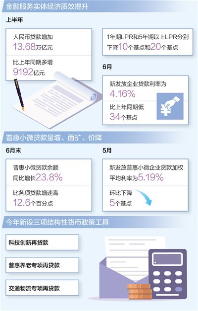 數(shù)據(jù)顯示,上半年,我國(guó)社會(huì)融資規(guī)模增量為21萬(wàn)億元,同比多增3.2萬(wàn)億元,人民幣貸款增加13.68萬(wàn)億元,比上年同期多增9192億元。與此同時(shí),央行持續(xù)釋放貸款市場(chǎng)報(bào)價(jià)利率(LPR)改革潛力,1年期LPR和5年期以上LPR分別下降10個(gè)基點(diǎn)和20個(gè)基點(diǎn),6月份新發(fā)放企業(yè)貸款利率為4.16%,比上年同期低34個(gè)基點(diǎn),企業(yè)綜合融資成本穩(wěn)中有降,金融服務(wù)實(shí)體經(jīng)濟(jì)的質(zhì)量和效率明顯提升。
