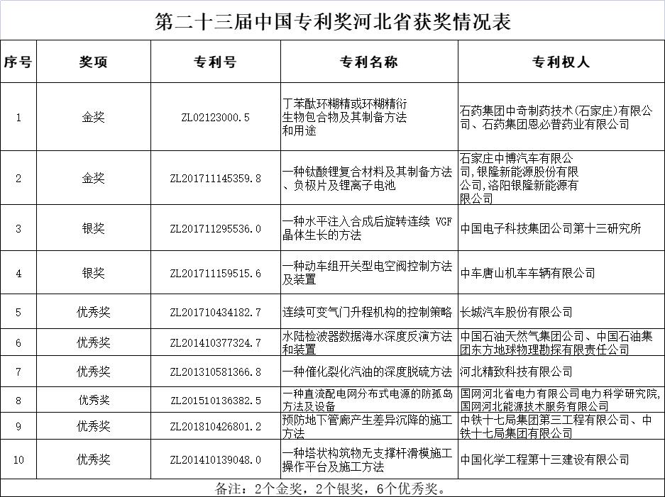 近日,國家知識產(chǎn)權(quán)局公布關(guān)于第二十三屆中國專利獎授獎的決定,河北省10項專利獲中國專利獎。其中,金獎、銀獎各2項,優(yōu)秀獎6項。河北省企業(yè)連續(xù)三年獲得中國專利獎金獎,金獎銀獎獲獎數(shù)量再創(chuàng)歷史新高。